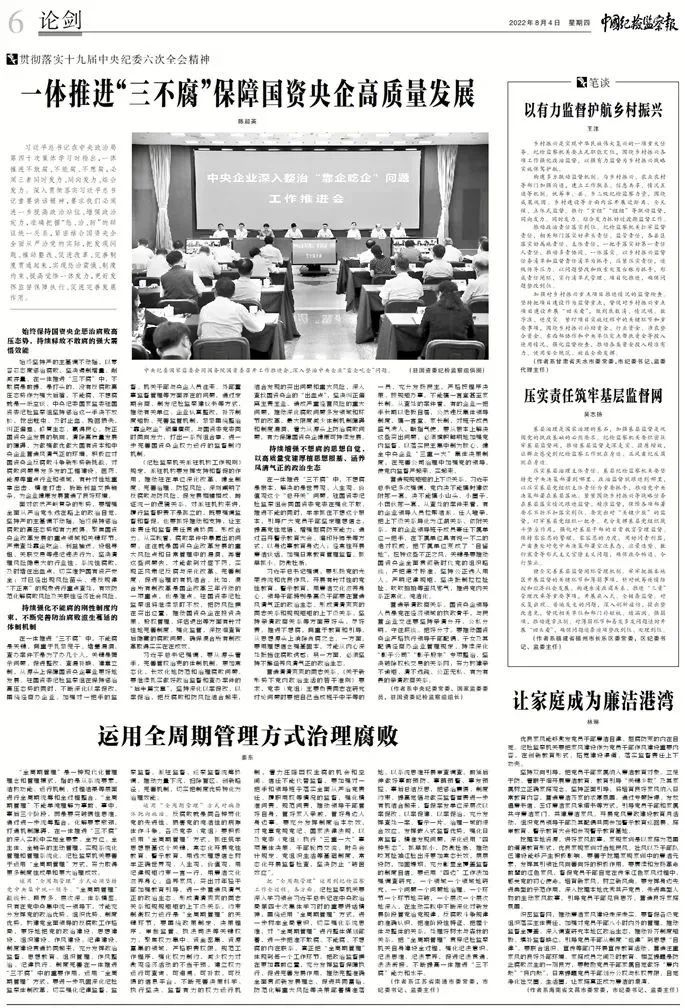 始終堅(jiān)持嚴(yán)的主基調(diào)不動搖,以零容忍態(tài)度懲治腐敗,堅(jiān)決遏制增量、削減存量。在一體推進(jìn)“三不腐”中,不敢腐是前提、是打頭的,沒有反腐敗高壓態(tài)勢作為強(qiáng)大后盾,不能腐、不想腐就是一紙空談。中央紀(jì)委國家監(jiān)委駐國資委紀(jì)檢監(jiān)察組堅(jiān)持懲治這一手決不放松,挖出蛀蟲、及時(shí)止血、挽回?fù)p失,糾正偏差、修復(fù)生態(tài)、贏得民心,撥正國資央企發(fā)展的航向,清除高質(zhì)量發(fā)展的障礙,為做強(qiáng)做優(yōu)做大國有資本和中央企業(yè)營造風(fēng)清氣正的環(huán)境。積極應(yīng)對國資央企反腐敗斗爭新形勢新挑戰(zhàn),對腐敗問題易發(fā)多發(fā)的工程建設(shè)、醫(yī)藥、能源等重點(diǎn)行業(yè)和領(lǐng)域,有針對性地重拳出擊、精準(zhǔn)打擊,斬?cái)嗬娼粨Q鏈條,為企業(yè)健康發(fā)展?fàn)I造了良好環(huán)境。面對依然嚴(yán)峻復(fù)雜的形勢,要增強(qiáng)全面從嚴(yán)治黨永遠(yuǎn)在路上的政治自覺,堅(jiān)持嚴(yán)的主基調(diào)不動搖,始終保持懲治腐敗的高壓態(tài)勢和有力威懾。聚焦國資央企改革發(fā)展的重點(diǎn)領(lǐng)域和關(guān)鍵環(huán)節(jié),嚴(yán)肅查處靠企吃企、利益輸送、設(shè)租尋租、關(guān)聯(lián)交易等違紀(jì)違法行為,堅(jiān)決清理風(fēng)險(xiǎn)隱患大的行業(yè)性、系統(tǒng)性腐敗,及時(shí)堵住出血點(diǎn),切實(shí)維護(hù)國有資產(chǎn)安全;對已經(jīng)出現(xiàn)風(fēng)險(xiǎn)苗頭、違反規(guī)律“不正?!钡默F(xiàn)象進(jìn)行重點(diǎn)查處,有效防范化解腐敗風(fēng)險(xiǎn)及關(guān)聯(lián)性經(jīng)濟(jì)社會風(fēng)險(xiǎn)。持續(xù)強(qiáng)化不能腐的剛性制度約束,不斷完善防治腐敗滋生蔓延的體制機(jī)制在一體推進(jìn)“三不腐”中,不能腐是關(guān)鍵,側(cè)重于扎緊籠子、堵塞漏洞。查辦案件不是為了辦幾個(gè)人,關(guān)鍵是揭示問題、促進(jìn)整改、查漏補(bǔ)缺、建章立制,從源頭上保障國資央企事業(yè)更好地發(fā)展。駐國資委紀(jì)檢監(jiān)察組在保持懲治高壓態(tài)勢的同時(shí),不斷深化以案促改,圍繞經(jīng)商辦企業(yè)、加強(qiáng)對一把手的監(jiān)督、機(jī)關(guān)干部與央企人員往來、外部董事監(jiān)督管理等方面存在的問題,通過定期會商、制發(fā)紀(jì)檢監(jiān)察建議書等方式,推動有關(guān)單位、企業(yè)認(rèn)真整改,補(bǔ)齊制度短板、完善監(jiān)管機(jī)制,緊緊圍繞整治“靠企吃企”頑瘴痼疾,與國資委黨委同時(shí)同向發(fā)力,打出一系列組合拳,進(jìn)一步完善國資央企權(quán)力運(yùn)行的監(jiān)督制約機(jī)制。《紀(jì)檢監(jiān)察機(jī)關(guān)派駐機(jī)構(gòu)工作規(guī)則》規(guī)定,派駐機(jī)構(gòu)要發(fā)揮支持和督促的作用,推動駐在單位深化改革、健全制度、完善治理、防控風(fēng)險(xiǎn),深刻闡明了反腐敗與防風(fēng)險(xiǎn)、促發(fā)展相輔相成、辯證統(tǒng)一的邏輯關(guān)系。對派駐機(jī)構(gòu)來講,履行監(jiān)督職責(zé)不是孤立的,既要強(qiáng)調(diào)監(jiān)督和督促,也要抓好推動和支持,讓主體責(zé)任和監(jiān)督責(zé)任貫通協(xié)同、形成合力。從實(shí)踐看,腐敗案件中暴露出的問題,往往就是國資央企改革發(fā)展的重大風(fēng)險(xiǎn)點(diǎn)和日常管理中的漏洞,奔著這些問題去,才能做到對癥下藥,實(shí)現(xiàn)正風(fēng)肅紀(jì)反腐與深化改革、完善制度、促進(jìn)治理的有機(jī)結(jié)合。比如,混合所有制改革是國企改革三年行動的一項(xiàng)重點(diǎn),也是難點(diǎn)。駐國資委紀(jì)檢監(jiān)察組將繼續(xù)緊盯不放,把防風(fēng)險(xiǎn)擺在突出位置,推動國資央企在投資決策、股權(quán)管理、評估退出等方面有針對性地完善制度、強(qiáng)化監(jiān)管,深挖細(xì)查背后隱藏的腐敗問題,確?;旌纤兄聘母锶〉脤?shí)實(shí)在在成效。習(xí)近平總書記強(qiáng)調(diào),要從源頭著手,完善管權(quán)治吏的體制機(jī)制,更加常態(tài)化、長效化地防范和治理腐敗問題。要繼續(xù)扎實(shí)做好政治監(jiān)督和查辦案件的“后半篇文章”,堅(jiān)持深化以案促改、以案促治,把反腐敗和防風(fēng)險(xiǎn)結(jié)合起來,結(jié)合發(fā)現(xiàn)的突出問題和重大風(fēng)險(xiǎn),深入查找國資央企的“出血點(diǎn)”,堅(jiān)決糾正偏離主責(zé)主業(yè)、造成嚴(yán)重經(jīng)營風(fēng)險(xiǎn)的重大問題,推動深化腐敗問題多發(fā)領(lǐng)域和環(huán)節(jié)的改革,最大限度減少體制機(jī)制障礙和制度漏洞,著力從源頭上防治腐敗問題,有力保障國資央企健康可持續(xù)發(fā)展。持續(xù)增強(qiáng)不想腐的思想自覺,以高質(zhì)量黨建厚植思想根基、涵養(yǎng)風(fēng)清氣正的政治生態(tài)在一體推進(jìn)“三不腐”中,不想腐是根本,解決的是世界觀、人生觀、價(jià)值觀這個(gè)“總開關(guān)”問題。駐國資委紀(jì)檢監(jiān)察組會同國資委黨委在強(qiáng)化不敢、推進(jìn)不能的同時(shí),牢牢抓住不想這個(gè)根本,引導(dǎo)廣大黨員干部堅(jiān)定理想信念,提高黨性覺悟,增強(qiáng)拒腐防變能力;通過召開警示教育大會、編印懺悔錄等方式,以身邊事教育身邊人;經(jīng)常性